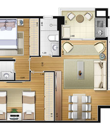 2 dorms, 1 suíte, 1 banheiro social, terraço gourmet, sala de jantar e sala de estar.